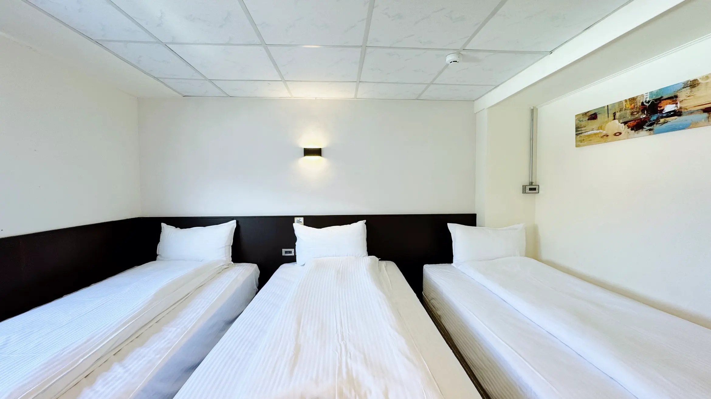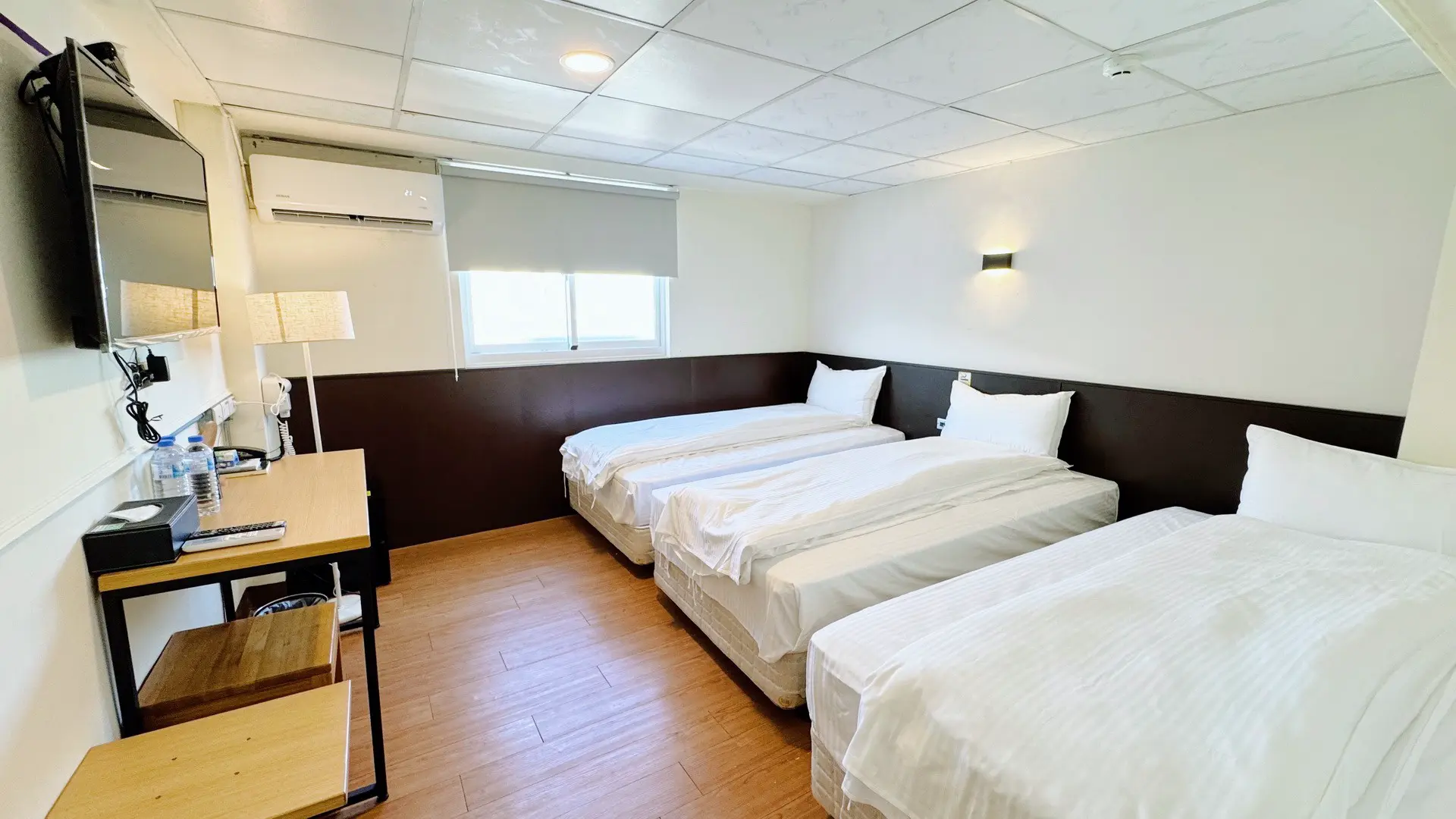 床鋪舒適約7-8坪溫馨空間,提供一張雙人床和一張單人床有獨立空調和私人衛浴。